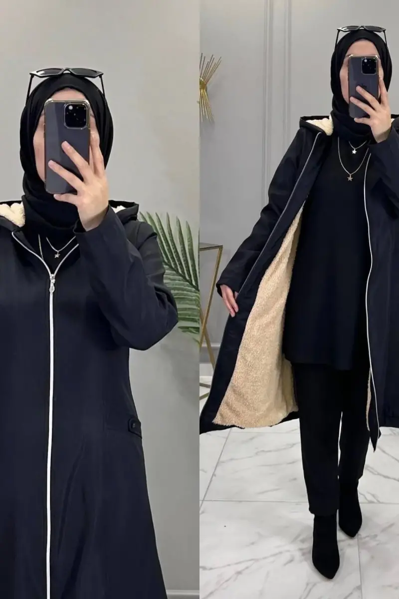 Bondit kumaş, kapşonuda kürklüdür, kolları elyaf dolgudur fermuarlı, 110 cm